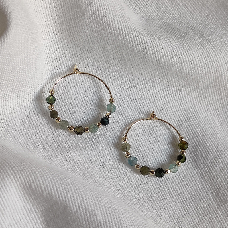 Beautifully cut tourmaline gemstones with warm green tones blended with gold beads. Also available in a mix of pink and green gemstones as shown.